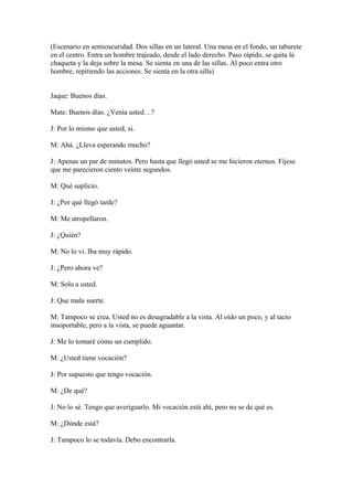 Dos hombres, Jaque y Mate, se encuentran atrapados en una sala después de una entrevista de trabajo fallida. Pasan el tiempo hablando de forma absurda y sin sentido hasta que finalmente deciden comprobar si la puerta está realmente cerrada empujándola. Al darse cuenta de que pueden salir, celebran su liberación antes de separarse e irse cada uno por su lado.