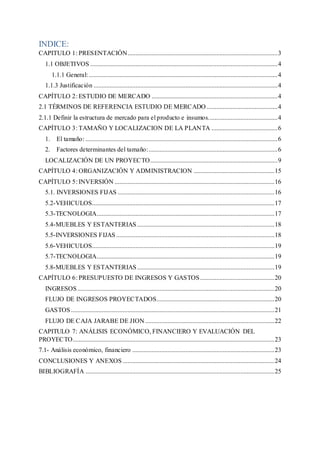Este documento presenta el primer avance del proyecto "Jarabe de Kion" elaborado por estudiantes de la Escuela Profesional de Administración de Empresas de la Filial Sicuani. El proyecto propone la elaboración de un jarabe a base de kion para tratar enfermedades respiratorias. Se incluye información sobre objetivos, estudio de mercado, tamaño y localización de la planta, organización, inversión requerida e ingresos y gastos proyectados.