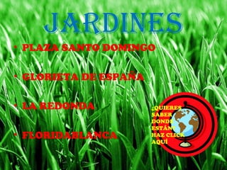 Este documento contiene información sobre varios jardines y plazas en Murcia, España. Describe brevemente la historia, características actuales y lugares cercanos de la Plaza Santo Domingo, la Glorieta de España, el Jardín de Floridablanca y La Redonda.