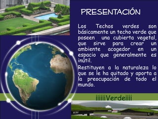 Este documento presenta información sobre los techos verdes y jardines. Explica que los techos verdes son cubiertas vegetales que crean un ambiente acogedor y restituyen la naturaleza. Describe diferentes tipos de jardines como extensivos, intensivos y paneles verticales. También proporciona ejemplos de techos verdes en la República Dominicana, México y otros países. Finalmente, ofrece recomendaciones sobre plantas, iluminación y mobiliario adecuados para techos verdes.
