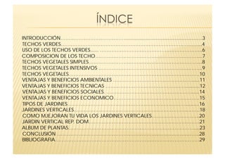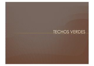 El documento trata sobre los techos verdes y jardines verticales. Explica que los techos verdes ayudan a reemplazar la vegetación perdida debido a la construcción de edificios y ofrecen múltiples beneficios ambientales, técnicos, sociales y económicos. También describe diferentes tipos de techos verdes e instalaciones y los beneficios de los jardines verticales para las ciudades.