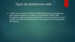 El documento habla sobre tipos de plataformas web como LAMP y sobre el diseño de páginas web. Explica que el diseño web implica tres etapas: 1) el diseño visual de la información, 2) la estructura y relación jerárquica de las páginas, y 3) el posicionamiento en buscadores. También define un sitio web como una colección de páginas relacionadas bajo un dominio y una página web como un documento electrónico que puede contener texto, sonido, video e imágenes y que se acce