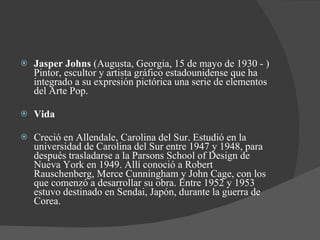 Jasper Johns es un pintor, escultor y artista gráfico estadounidense conocido por integrar elementos del Arte Pop en su obra pictórica. Estudió en la Universidad de Carolina del Sur y la Parsons School of Design de Nueva York, donde conoció a artistas como Robert Rauschenberg. Sus primeras obras se centraron en temas como banderas y letras, pintadas de forma objetiva para que el cuadro se convirtiera en un objeto. Más tarde incorporó objetos reales a sus lienzos y expuso una serie de cuatro pinturas titulada Las