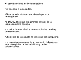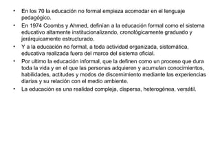 Este documento discute la naturaleza de la educación formal e informal. Define la educación formal como un sistema altamente institucionalizado y estructurado jerárquicamente, mientras que la educación informal ocurre a través de experiencias diarias. También distingue la educación no formal como actividades educativas organizadas que tienen lugar fuera del sistema escolar formal. El objetivo final es destacar que la educación es un proceso complejo que incluye diferentes modalidades a lo largo de la vida de una persona.
