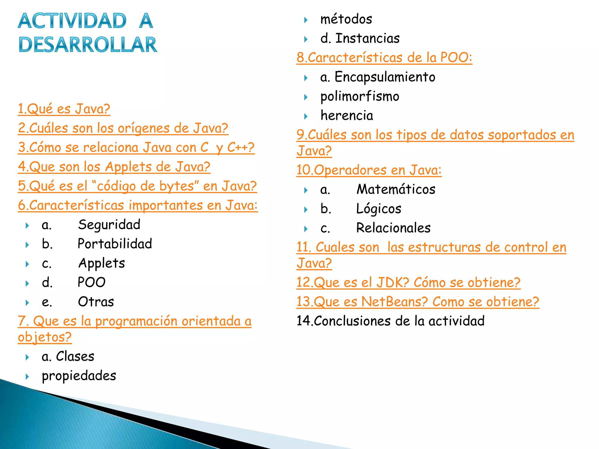 Java es un lenguaje de programación orientado a objetos creado originalmente por Sun Microsystems. Ofrece características como seguridad, portabilidad y programación orientada a objetos. El documento explica los orígenes de Java, sus características clave, tipos de datos, operadores, estructuras de control, JDK, NetBeans y conceptos básicos de programación orientada a objetos como clases, métodos y encapsulamiento.