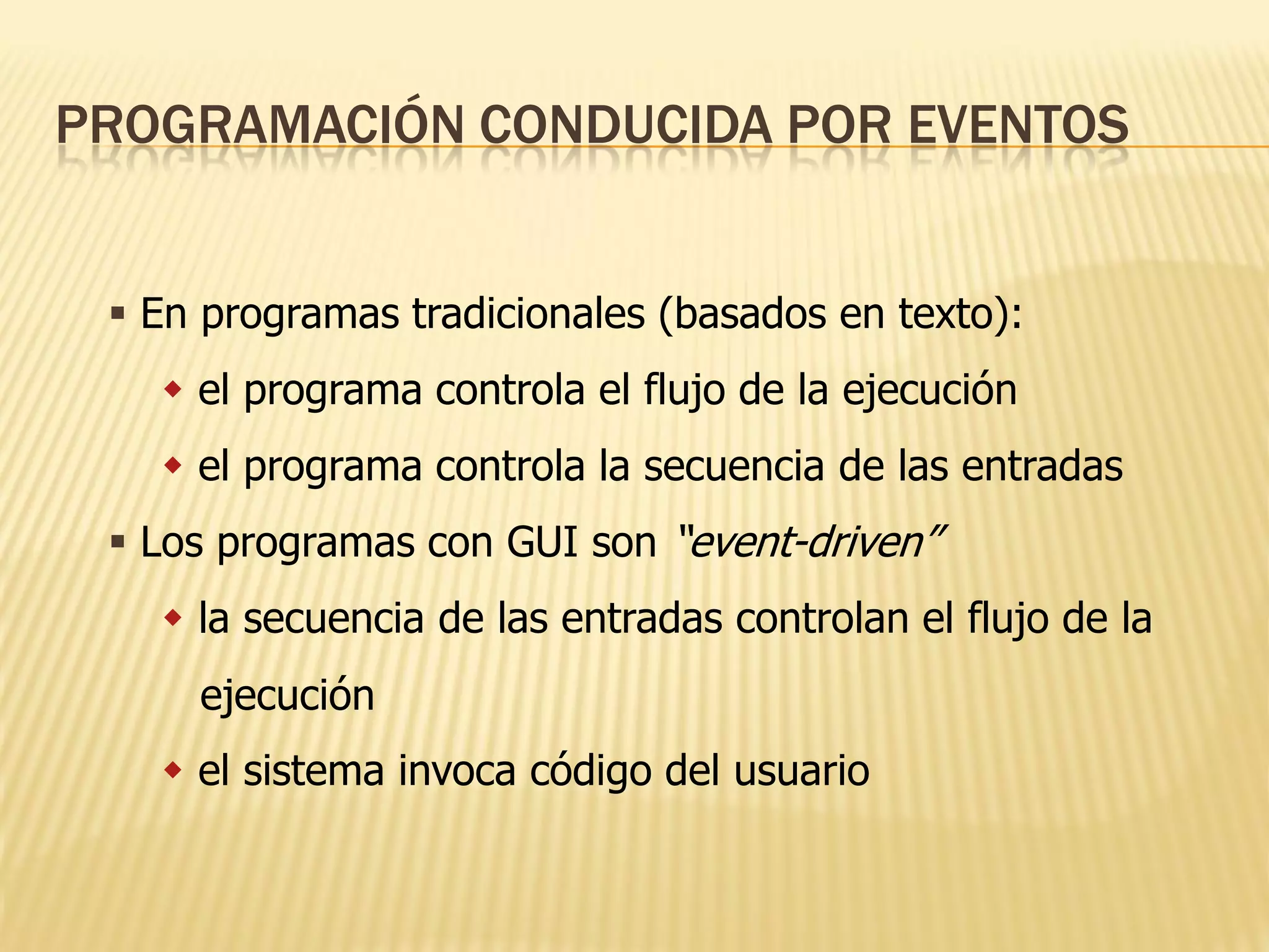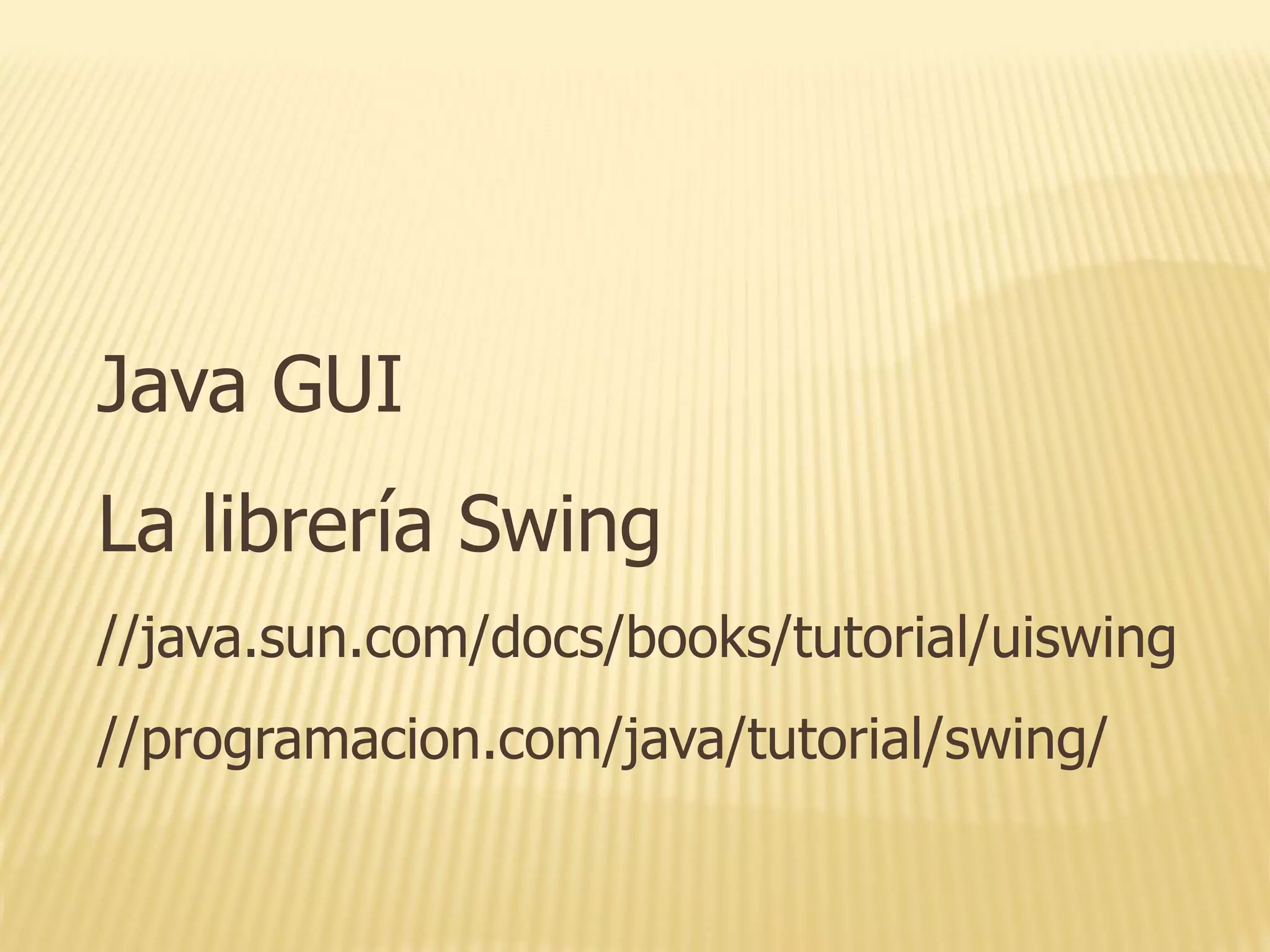Este documento describe los conceptos básicos de la programación GUI en Java utilizando Swing. Explica que los programas GUI en Java son impulsados por eventos, donde las acciones del usuario generan eventos que invocan el código del programa. También describe la jerarquía de herencia y contenedores de Swing, los tipos básicos de componentes como botones y menús, y cómo crear una simple aplicación Swing "Hola Mundo".