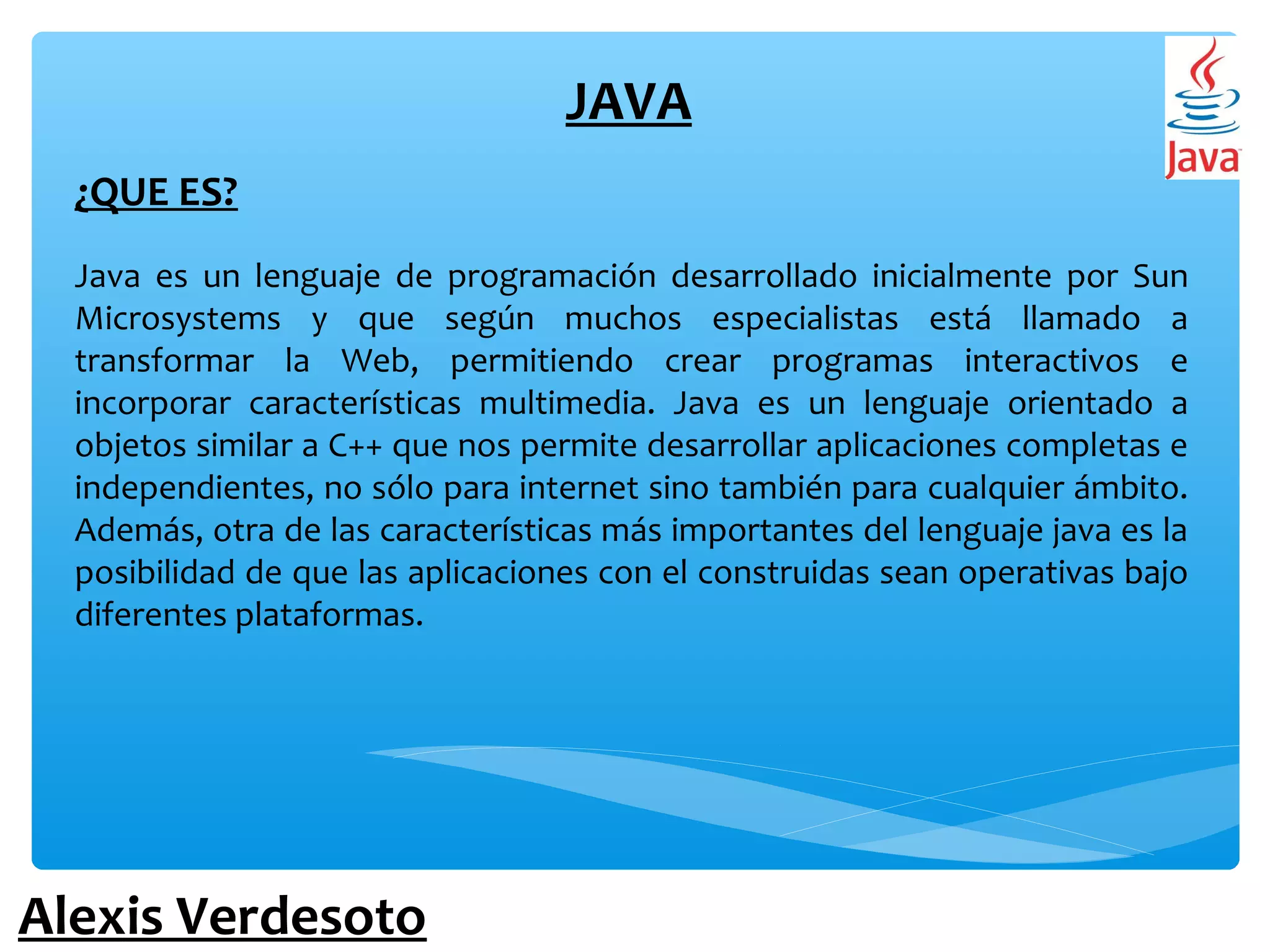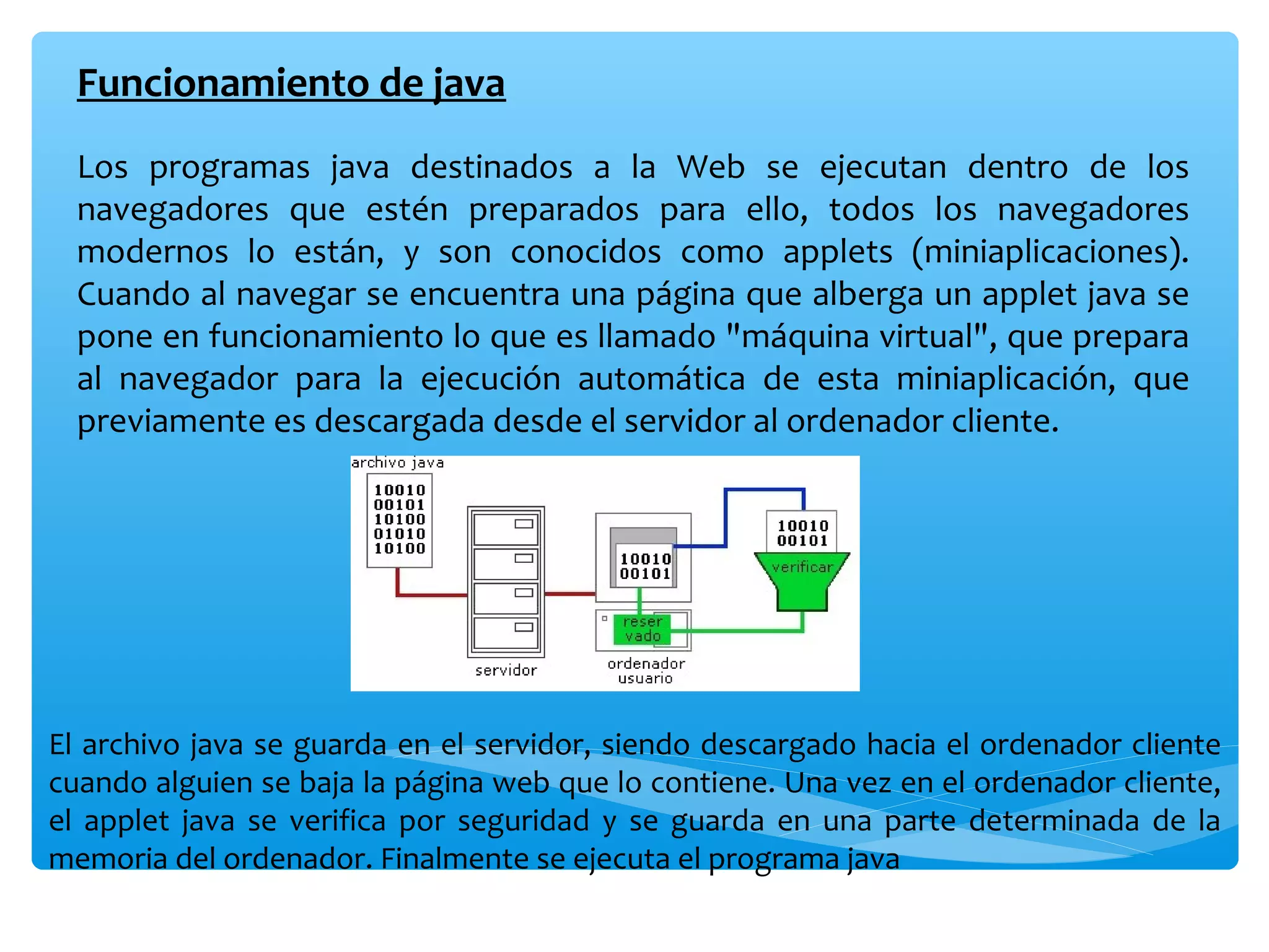 Java es un lenguaje de programación orientado a objetos que permite crear aplicaciones que funcionan en múltiples plataformas. Los programas Java se ejecutan dentro de un navegador a través de applets pequeñas aplicaciones que son descargadas de un servidor web al ordenador cliente, donde son verificadas por seguridad antes de ejecutarse.