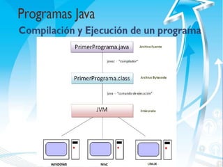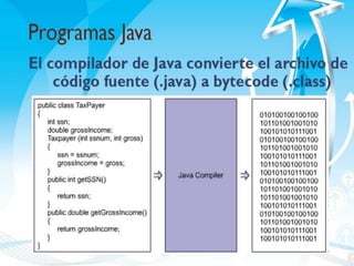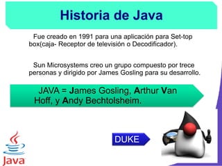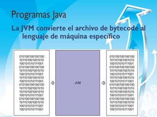 Java fue creado originalmente en 1991 por Sun Microsystems para aplicaciones de cajas receptoras de televisión. Java es un lenguaje de programación orientado a objetos, interpretado y compilado que es multiplataforma y se utiliza comúnmente para el desarrollo de aplicaciones web. El programa Java se compila a bytecode que es ejecutado por la máquina virtual de Java (JVM) en cualquier sistema operativo.