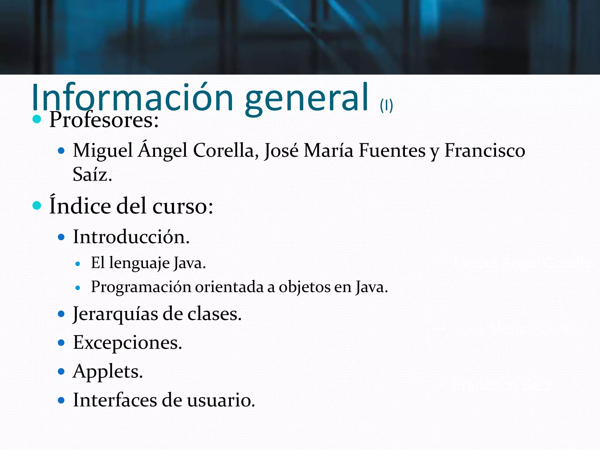Este documento presenta información general sobre un curso de Java, incluyendo los profesores, índice del curso y bibliografía. Luego resume las características principales de Java como lenguaje interpretado, fuertemente tipado y portable. Finalmente, explica conceptos clave como el desarrollo en Java, compilación e interpretación, y comparativa con C++.