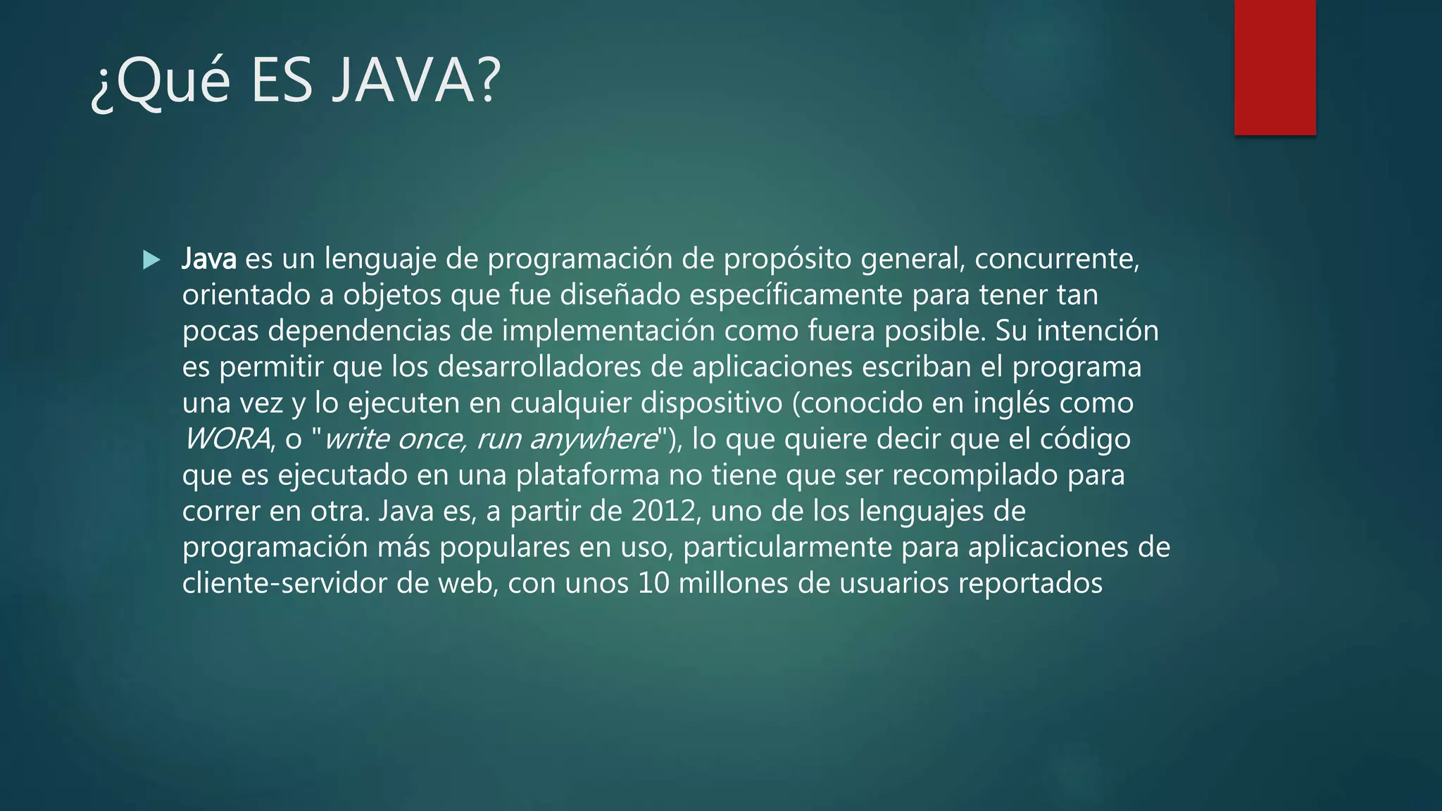 Java es un lenguaje de programación orientado a objetos creado en 1991 por James Gosling y su equipo en Sun Microsystems para proyectos de televisión interactiva. Se diseñó para ser independiente de la plataforma y permitir que el código escrito se ejecute en cualquier dispositivo. En 1994 se presentó por primera vez y en 1995 se hizo público junto con el navegador HotJava, convirtiéndose desde entonces en uno de los lenguajes más populares, especialmente para aplicaciones web.
