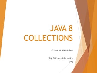 Este documento describe las colecciones en Java 8, incluyendo tipos de colecciones, métodos básicos como agregar, iterar y eliminar elementos, y novedades como expresiones lambda y streams. Las colecciones representan grupos de objetos y existen diversos tipos según si sus elementos están ordenados o permiten repetición. Java 8 introdujo mejoras como métodos removeIf y sort que permiten eliminar o ordenar elementos usando expresiones lambda.