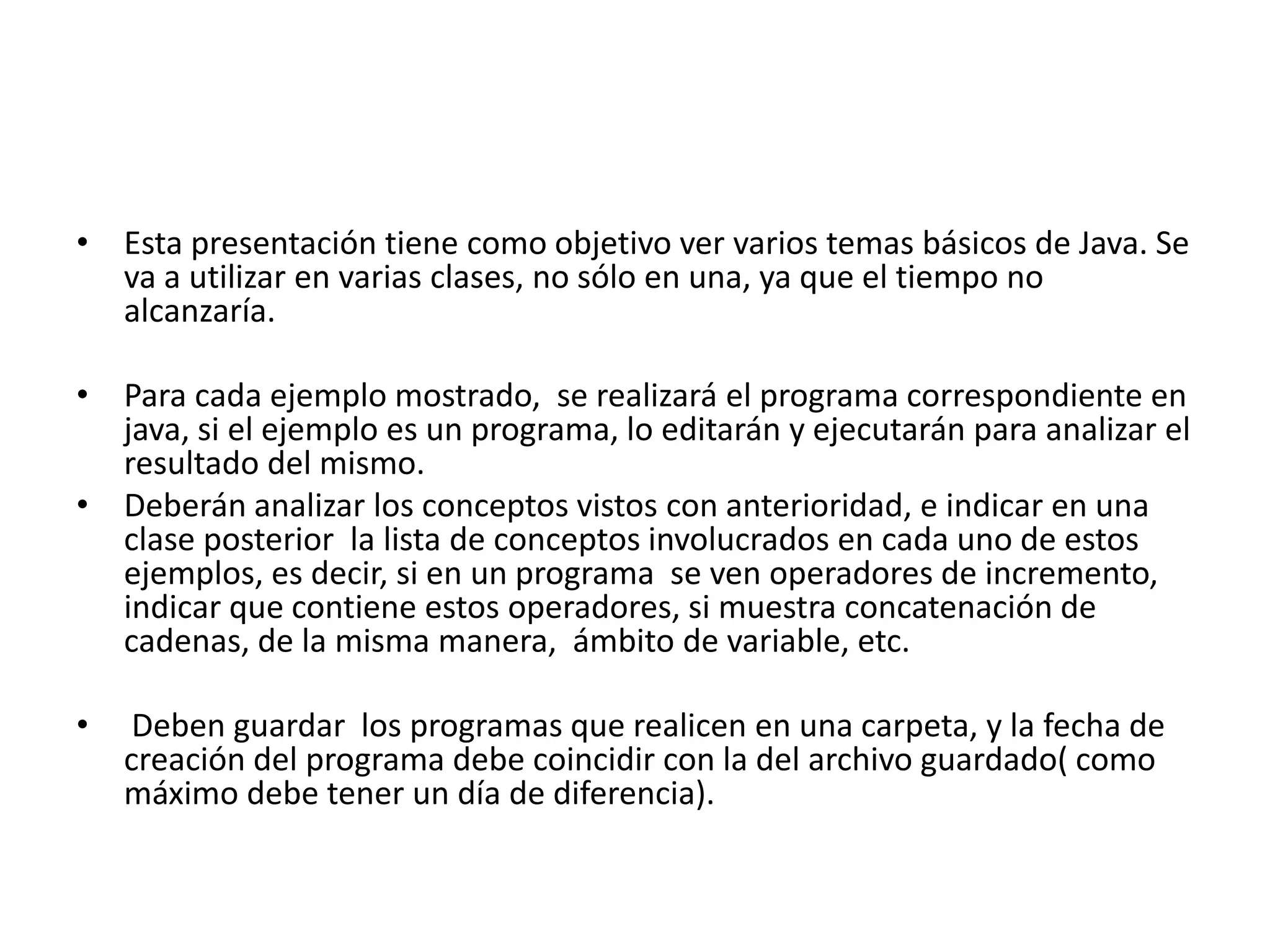 Este documento presenta varios temas básicos de Java que se verán a lo largo de varias clases. Incluye ejemplos de programas en Java sobre áreas de círculos, ámbito de variables, conversión de tipos, sentencias de control como if/else y switch, y bucles while. Los estudiantes deberán analizar los conceptos en cada ejemplo y guardar los programas realizados.