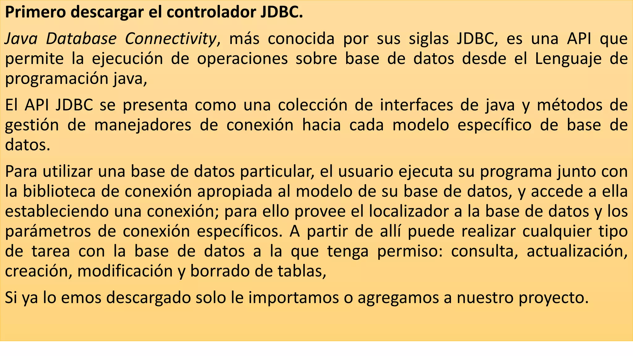 El documento describe cómo conectarse a una base de datos desde Java usando JDBC. Primero se debe descargar el controlador JDBC apropiado y luego establecer una conexión mediante DriverManager.getConnection. Una vez conectado, se pueden crear objetos Statement para ejecutar consultas SQL y obtener resultados a través de objetos ResultSet.