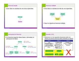 Este documento describe la herencia en programación orientada a objetos. La herencia permite que una clase herede propiedades y métodos de otra clase existente llamada superclase. Las subclases heredan atributos y comportamientos de su superclase y pueden agregar o modificar propiedades. Se explican conceptos como superclase, subclase, jerarquías de herencia, herencia simple y múltiple.