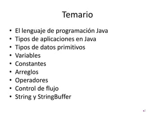 El documento es una introducción al lenguaje de programación Java, cubriendo sus características, modelos, tipos de aplicaciones y ejemplos de código. Se destacan aspectos como la naturaleza orientada a objetos de Java, su portabilidad gracias al bytecode, y la estructura básica de programas en Java. También se abordan temas como tipos de datos, variables, control de flujo, y arreglos, proporcionando un panorama general sobre la sintaxis y funcionalidades del lenguaje.