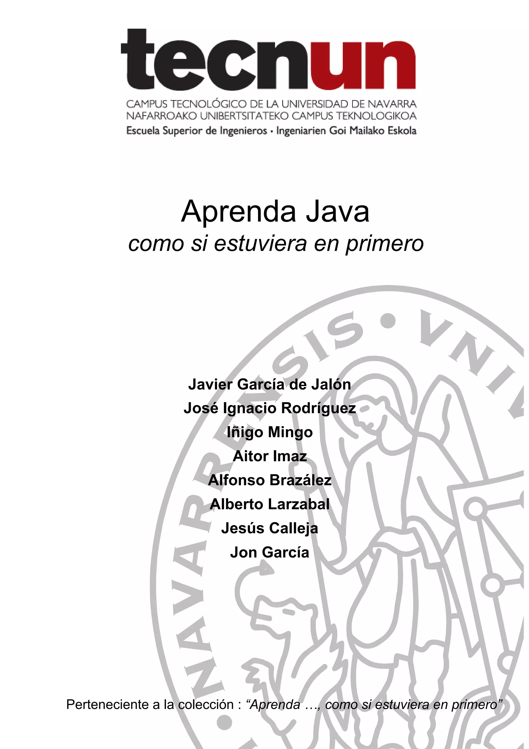 Este documento presenta un curso introductorio sobre programación en Java. Comienza explicando los conceptos básicos de Java como el compilador, la máquina virtual de Java y la estructura de un programa Java. A continuación, explica conceptos de programación como variables, operadores, estructuras de control de flujo y clases. Finalmente, describe algunas clases de utilidad como arrays, cadenas de caracteres, colecciones y el toolkit gráfico AWT.