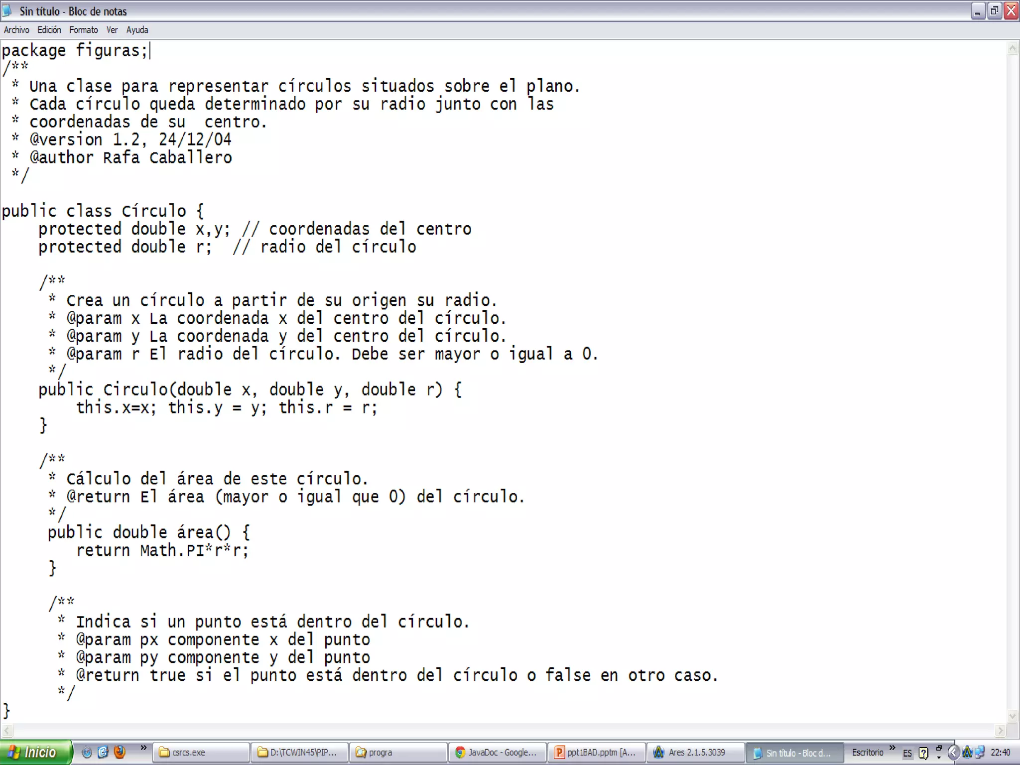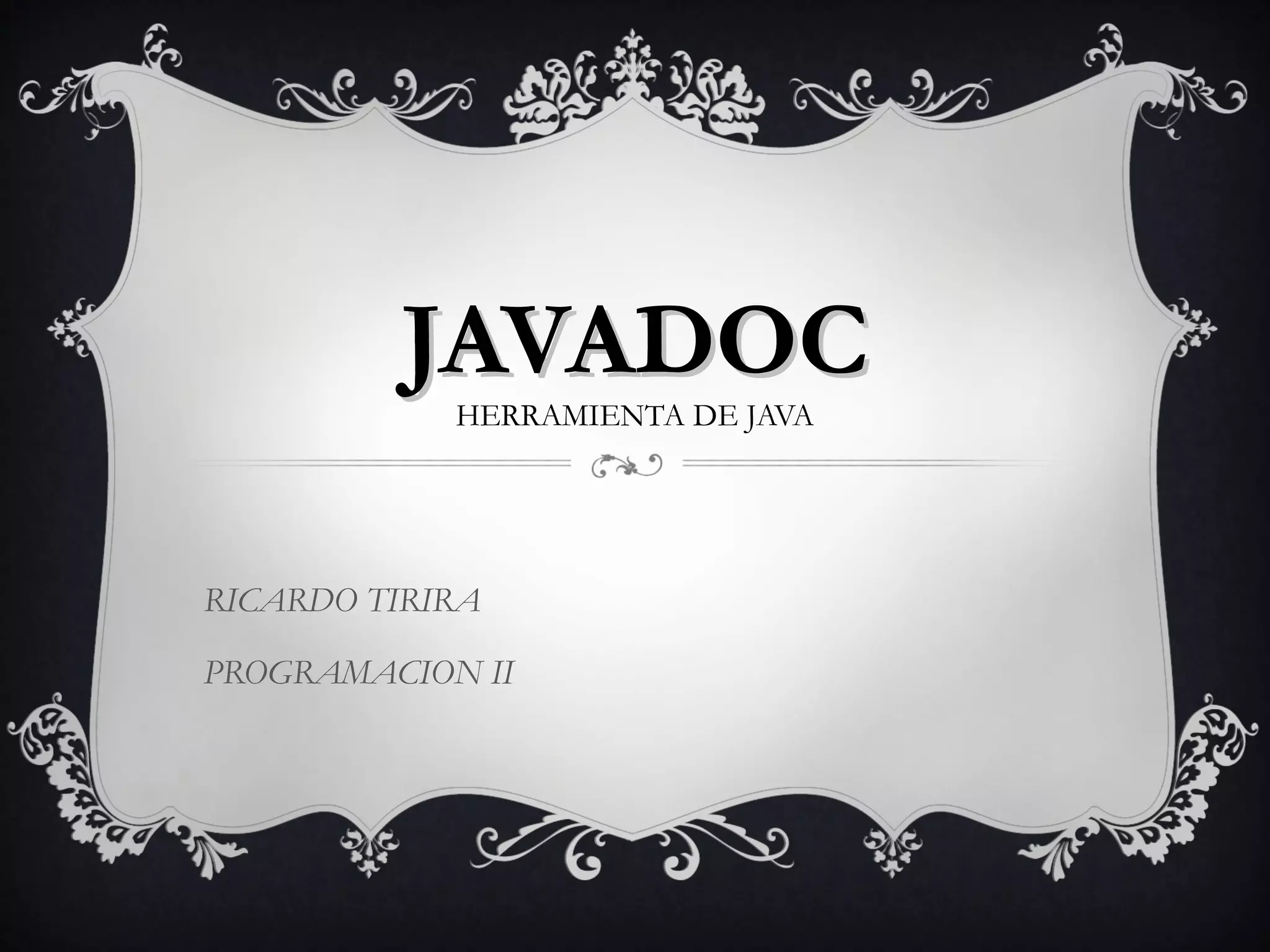 Este documento explica los comentarios en Java y la herramienta Javadoc. Detalla los tipos de comentarios en Java, como los comentarios de línea y los comentarios JavaDoc. Describe el formato y etiquetas de los comentarios JavaDoc, como @author, @param y @return. También cubre cómo generar documentación HTML usando la herramienta Javadoc en línea de comandos.