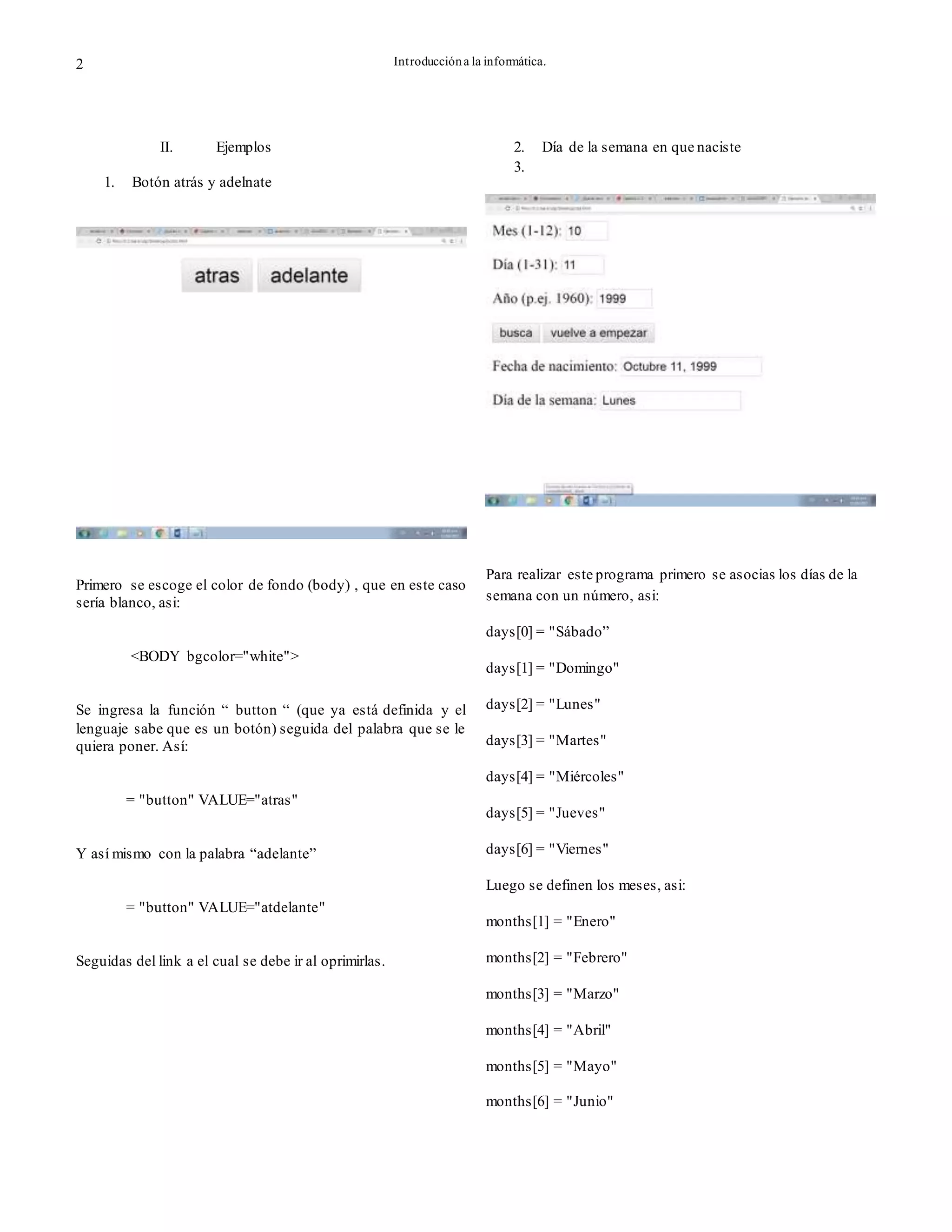 El documento introduce JavaScript como un lenguaje de programación robusto que puede usarse para crear interactividad dinámica en sitios web. Explica que JavaScript permite hacer desde efectos simples como carruseles hasta aplicaciones más complejas basadas en bases de datos. Proporciona ejemplos de código JavaScript para crear botones de avance y retroceso en una página y determinar el día de la semana en que una persona nació basado en su fecha de nacimiento.