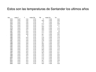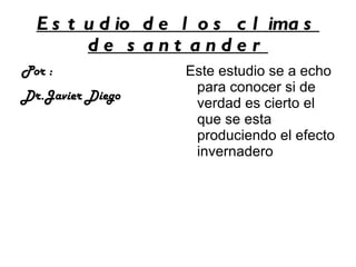 Este estudio analiza las temperaturas, precipitaciones, vientos, días de lluvia, nieve, tormenta, niebla y granizo en Santander en los últimos años para determinar si se ha producido el efecto invernadero. Los resultados muestran que las temperaturas no han aumentado ni disminuido significativamente, lo que sugiere que el efecto invernadero no ha afectado a Santander. El estudio proporciona datos y gráficas detalladas sobre cada variable climática.