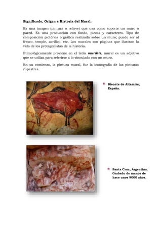 El documento explora el significado, origen e historia del mural como forma de arte, destacando su evolución desde las pinturas rupestres hasta el muralismo moderno en México. Se detalla las técnicas murales como el fresco, el mosaico y el esgrafiado, y se mencionan prominentes muralistas como Diego Rivera y José Clemente Orozco, quienes buscaron transmitir mensajes sociales y políticos a través de sus obras. Además, subraya la importancia de los murales en la expresión cultural y su papel en la historia reciente de México y otras partes del mundo.
