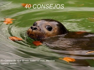 Este documento contiene 40 consejos para vivir una vida plena y feliz. Algunos consejos incluyen caminar diariamente, escuchar música, leer libros, comer alimentos saludables, reír y sonreír más, pasar tiempo con amigos y familia, y apreciar cada día. El objetivo general es disfrutar la vida al máximo.