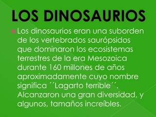 Los dinosaurios dominaron la Tierra durante 160 millones de años hasta su extinción hace 65 millones de años. La teoría más aceptada es que un asteroide gigante impactó la Tierra en la península de Yucatán, desencadenando cambios climáticos extremos que acabaron con la mayoría de especies incluyendo los dinosaurios. Había unas 700 especies conocidas de dinosaurios, que evolucionaron de los arcosaurios.