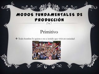 Este documento describe los modos fundamentales de producción a través de la historia, incluyendo el primitivo, esclavismo, feudalismo, capitalismo y socialismo. Explica cómo cada sistema económico satisface las necesidades humanas básicas de forma diferente, y cómo evolucionaron uno del otro a medida que crecía la población y cambiaban las relaciones sociales.