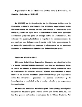 La UNESCO es la organización de las Naciones Unidas para la educación, la ciencia y la cultura. Tiene su sede en París y oficinas regionales, incluida una en Santiago de Chile que se centra en América Latina y el Caribe. La UNESCO trabaja para promover la paz, los derechos humanos y el desarrollo sostenible a través de programas educativos, científicos, culturales y de comunicación.