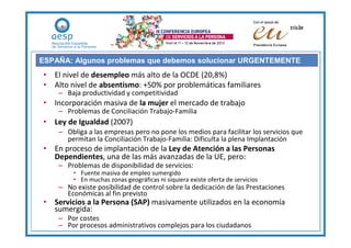 El documento propone medidas para desarrollar los Servicios a las Personas (SAP) en España. Actualmente, muchos SAP se prestan en la economía sumergida. Se propone crear una Agencia Nacional de SAP para regular el sector, crear acreditaciones, y modificar normativas para que los costos en la economía formal no sean mayores que en la sumergida. Esto podría generar 700,000 nuevos empleos en 5 años y ahorrar un 20% en recursos públicos. Los SAP pueden crear mucho empleo si se implementan correctamente.