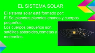 El documento describe el sistema solar, incluyendo el sol, los planetas (Mercurio, Venus, Tierra, Marte, Júpiter, Saturno, Urano y Neptuno), Plutón, satélites, asteroides, cometas y meteoritos. Los planetas giran alrededor del sol y no tienen luz propia, mientras que los satélites giran alrededor de los planetas. Los asteroides y cometas siguen órbitas alrededor del sol, y los meteoritos son pequeños asteroides que chocan con otros cuerpos celestes.