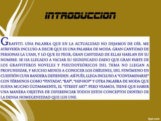 El documento describe el graffiti, explicando que son inscripciones o pintadas generalmente en el mobiliario urbano. Explica que su origen se remonta a las inscripciones romanas y que se popularizó en la década de 1970 en Estados Unidos como parte de la cultura hip hop. También describe algunos estilos como tagging, throw up y tren limpio, e indica que aunque a veces es visto como vandalismo, otros lo consideran un arte visual que ha ganado popularidad a nivel mundial.