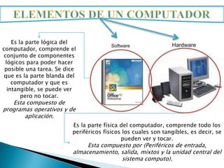El documento describe los componentes principales de un computador, incluyendo la parte lógica (software) y física (hardware). La parte lógica incluye programas operativos y de aplicación, mientras que la parte física incluye periféricos de entrada, salida, almacenamiento, mixtos y la unidad central. La unidad central contiene la tarjeta madre, microprocesador, memoria y buses que permiten la comunicación entre componentes.