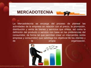 El documento resume los conceptos clave de la mercadotecnia, incluyendo sus cuatro elementos principales (las 4 P): Producto, Promoción, Plaza y Precio. Explica que la mercadotecnia se encarga de planear las actividades de la empresa relacionadas con estos elementos para crear un intercambio satisfactorio entre la empresa y el consumidor. También describe brevemente cada uno de los cuatro elementos y algunos de sus componentes como la mezcla de productos, los medios de promoción y los canales de distribución.