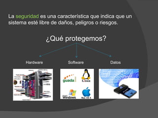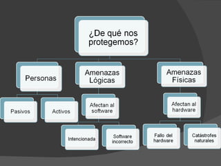Este documento resume los conceptos clave de seguridad informática, incluyendo la protección del hardware, software y datos a través de contraseñas, permisos, firewalls y antivirus, así como los riesgos de malware y la importancia de realizar copias de seguridad de los datos.