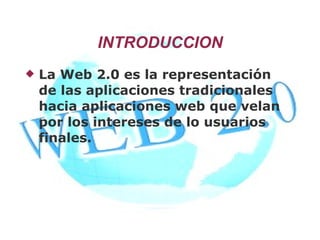 La Web 2.0 representa una transición hacia aplicaciones web centradas en el usuario. Permite a los usuarios ver, escuchar y compartir contenidos como audios, videos, fotos y presentaciones. Incluye sitios populares como YouTube y Flickr para videos y fotos, Blogger y Scribd para documentos, y sitios de música como YouTube y Musica.com.