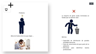 El documento describe los problemas con la inversión en fondos, incluyendo la falta de conocimiento de los inversores y la dificultad de identificar buenos gestores. Propone Vadevalor como una solución que clasifica fondos y gestores basado en criterios objetivos y proporciona una herramienta de búsqueda para ayudar a los inversores a encontrar opciones de inversión de alto valor. El objetivo final es establecer a Vadevalor como una marca global respetada por su independencia e imparcialidad.