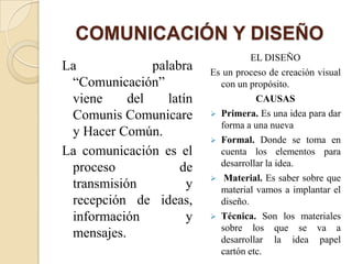 El diseño gráfico es un proceso de creación visual con un propósito. Tiene cuatro causas: la idea, la forma, el material y la técnica. La comunicación gráfica transmite mensajes a través de imágenes visuales y ha evolucionado desde las pinturas rupestres hasta la imprenta moderna. Los campos de acción del diseñador gráfico incluyen proyectos de diseño gráfico, señalización, diseño editorial y de imagen corporativa.