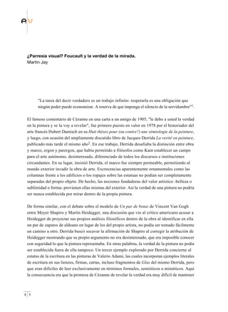 Este documento explora la relación entre visualidad y verdad en el trabajo de Michel Foucault. Argumenta que aunque Foucault reconoció los peligros de la "hegemonía del ojo", también entendió que existían prácticas visuales alternativas que podían ser emancipatorias. Sin embargo, estas prácticas no podían restaurar la "inocencia del ojo" ni establecer verdades trascendentales. Para Foucault, la verdad estaba determinada por los sistemas discursivos históricos, más que por la correspondencia con la real