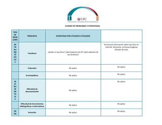 El documento presenta un cuadro de problemas y estrategias para la traducción. Incluye una pregunta temática sobre Jay Chou y la estrategia de buscar información sobre él en internet y páginas oficiales. También describe una estrategia léxica de buscar primero el significado de palabras desconocidas en diccionarios monolingües de la lengua base y meta y luego en diccionarios bilingües.