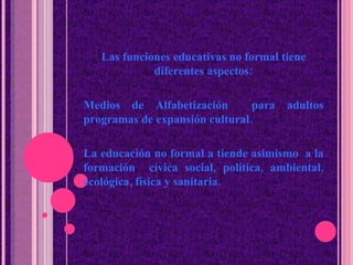 Este documento describe el sector educativo no formal. La educación no formal incluye programas de alfabetización para adultos y expansión cultural, y se enfoca en formación cívica, social, política, ambiental, física y de salud. Los objetivos son más específicos y prácticos que la educación formal. La educación no formal satisface necesidades inmediatas de los estudiantes y puede ser impartida por profesionales o semiprofesionales sin título académico. Los contenidos tienden a ser funcionales en lugar de abstractos, y