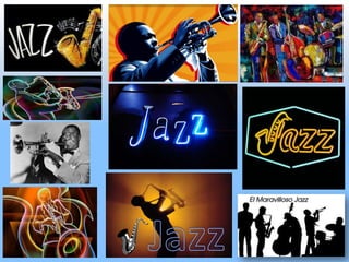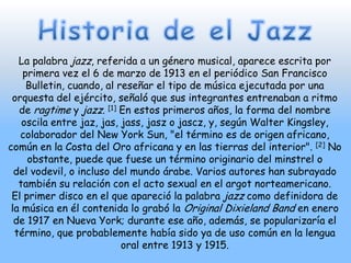 El documento explora el origen de la palabra "jazz" y su uso para describir un género musical. Se menciona que el término apareció por primera vez impreso en 1913 en un periódico de San Francisco al referirse a la música de una banda del ejército. En los primeros años su ortografía varió, y se sugiere que podría provenir del mundo del minstrel, el vodevil o el árabe. El primer disco que usó "jazz" para describir su música fue grabado en 1917.