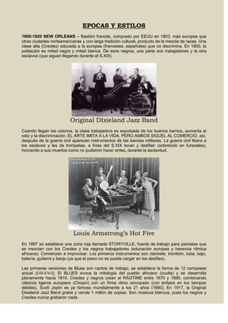 Este documento resume la historia y los orígenes del jazz, desde sus raíces africanas y europeas hasta su desarrollo en Nueva Orleans y otras ciudades estadounidenses en los siglos XIX y XX. Explica los estilos principales como el blues, ragtime, dixieland, bebop, cool jazz y fusiones posteriores. También presenta breves biografías de importantes músicos de jazz como Louis Armstrong, Duke Ellington, Charlie Parker y Miles Davis.