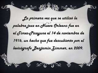 El documento proporciona información sobre el origen y desarrollo del jazz. La palabra jazz se utilizó por primera vez en Nueva Orleans en 1916. Los músicos pioneros incluyen a Duke Ellington y Eddie Condon. Los instrumentos más comunes son el saxo, la trompeta y el piano. Los estilos de jazz más populares van desde el ragtime hasta el jazz fusión.