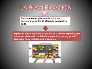 La planificación consiste en un proceso de toma de decisiones para alcanzar un objetivo mediante la elaboración de un plan explícito que puede ser individual o colectivo. La planificación tiene características como ser un proceso permanente, incluir alternativas y pasos sucesivos, y permite la coordinación de actividades para lograr los objetivos previstos. Algunos principios clave de la planificación incluyen que debe ser factible, basarse en datos objetivos, y ser flexible para adaptarse a los cambios.
