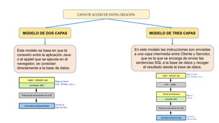 Este documento describe la conectividad Java a bases de datos (JDBC) y sus características principales. Explica los modelos de acceso a datos de dos y tres capas, las clases y tipos de datos JDBC, y cómo establecer conexiones y consultar datos. También proporciona ejemplos de aplicaciones JDBC para conectarse a bases de datos, trabajar con tipos de datos y conjuntos de resultados.