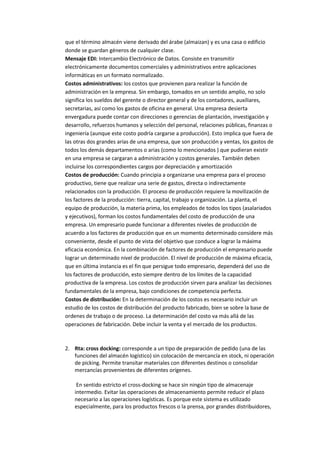 El documento define términos logísticos como recepción de carga, pedido, proveedor y centro de distribución. Explica que el cross docking implica la preparación de pedidos sin almacenamiento intermedio para agilizar las operaciones logísticas. Describe dos tipos de cross docking (por producto y por pedido) y elabora diagramas de flujo. Además, define códigos de barras y tipos como EAN 128 y explica su uso para la trazabilidad de productos. Por último, define la IAC en sistemas de inyección
