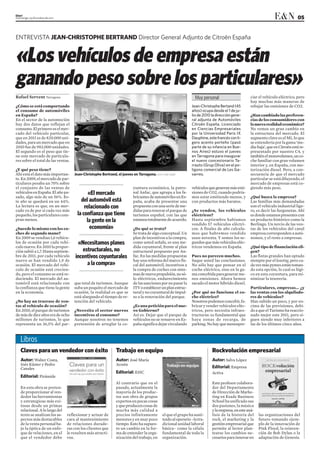 Este documento presenta una entrevista con Jean-Christophe Bertrand, director general adjunto de Citroën España. Bertrand discute cómo el mercado de automóviles en España está cambiando, con las ventas de vehículos particulares disminuyendo y las ventas de vehículos de empresa aumentando. También aboga por planes estructurales a largo plazo, en lugar de incentivos coyunturales, para renovar el parque automovilístico español y reducir las emisiones.