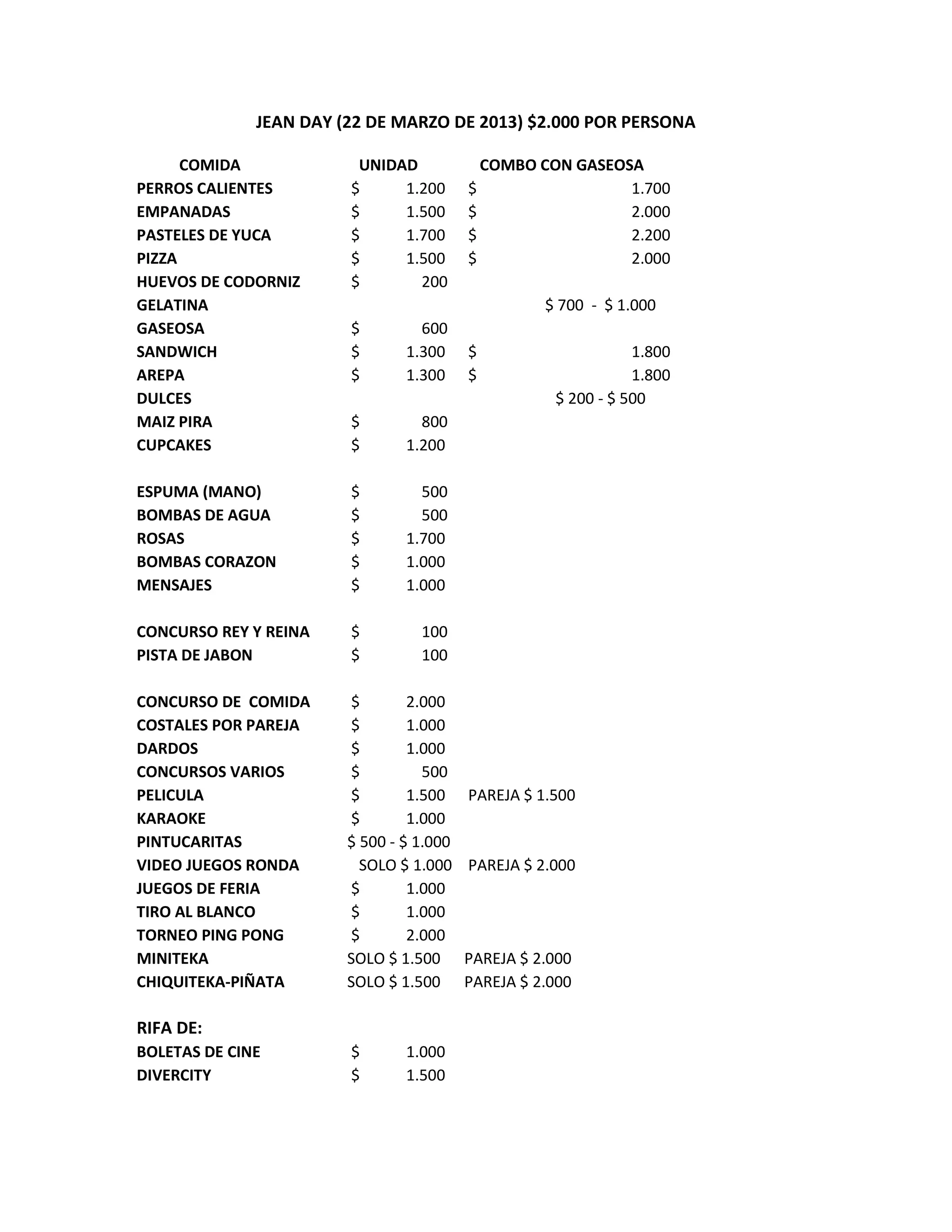 Este documento presenta una lista de precios para diferentes elementos de una fiesta llamada "Jean Day" que se llevará a cabo el 22 de marzo de 2013. Incluye precios para comida como perros calientes, empanadas y pasteles de yuca, así como bebidas y actividades como concursos, juegos, películas y rifas de boletas de cine y entradas a Divercity. Los precios van desde $100 para concursos hasta $2,000 para un torneo de ping pong o paquetes de comida y bebida.