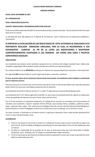 El documento proporciona indicaciones y recomendaciones para un "jean day" en un colegio el 29 de septiembre. Señala que los estudiantes pueden asistir con el uniforme completo o ropa de calle apropiada, pero no prendas deportivas o gorras. Sugiere traer materiales reciclables y que las clases seguirán el horario normal. Además, advierte que la evaluación de este evento determinará si se realizan otros similares y pide a los estudiantes cumplir las normas para mantener una buena convivencia