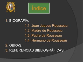 Este documento presenta una biografía detallada de Jean Jacques Rousseau, filósofo y escritor suizo. Describe su lugar y fecha de nacimiento, su familia y la educación que recibió. También resume las principales etapas de su vida, sus obras más importantes como El contrato social y Emilio, y los últimos años de su vida hasta su muerte en 1778.
